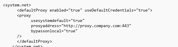 The machine.config file has also been modified to consider this proxy configuration as shown in the following lines