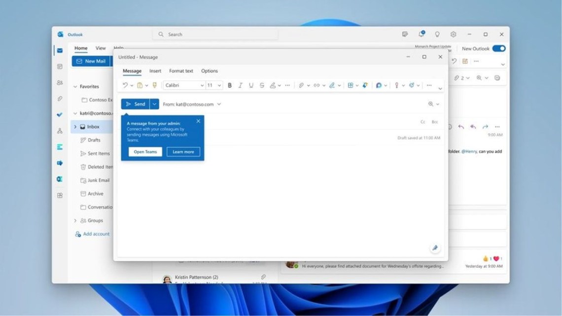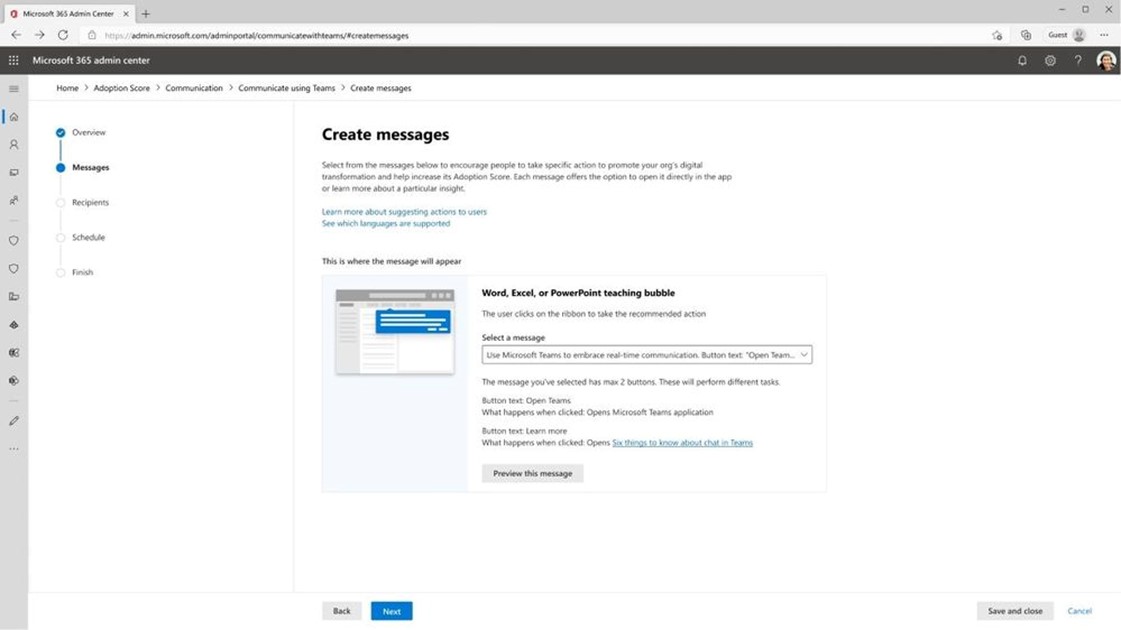 Les messages modélisés sont délivrés aux utilisateurs dans leur flux de travail à travers les surfaces, notamment Outlook, Excel, PowerPoint et Word. Les professionnels autorisés peuvent utiliser l’assistant de messages organisationnels dans Adoption Score pour choisir jusqu’à trois types de messages modélisés, définir quand et à quelle fréquence un message peut être affiché, et exclure des groupes ou des comptes prioritaires de la réception du message.