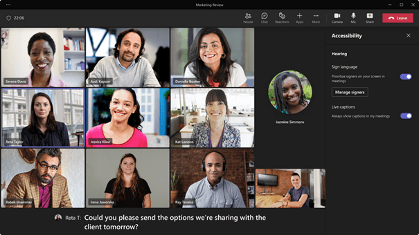 Enfin, nous avons fait en sorte que les préférences soient permanentes. Vous n’aurez plus à vous soucier des fonctionnalités et des vues lorsque vous rejoindrez une réunion. Dans le nouveau volet Accessibilité du menu Paramètres, vous pouvez activer l’affichage en langue des signes par défaut pour toutes vos réunions, et pré-identifier un ensemble de signataires préférés avec lesquels vous travaillez régulièrement au sein de votre organisation – par exemple, vos interprètes habituels (ou pour les interprètes, vos clients habituels). Le volet offre également une option permettant d’activer les sous-titres pour toutes vos réunions. En définissant ces préférences à l’avance, il est plus facile de rejoindre les appels plus rapidement, ce qui vous permet d’attraper les premières minutes de bavardage ou de plonger directement dans une conversation plus approfondie.