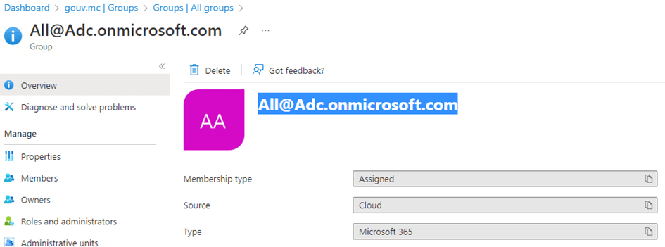 Bon après plusieurs tentatives et 3 heures d’Avatar 2 (à fuir sauf si vous aimer la guerre et les clichés, le film en est rempli! ) je me suis dit, au lieu de mettre le nom du groupe, pourquoi ne pas mettre l’adresse primaire SMTP du groupe. Et la Bingo ca fonctionne !! Grrrr