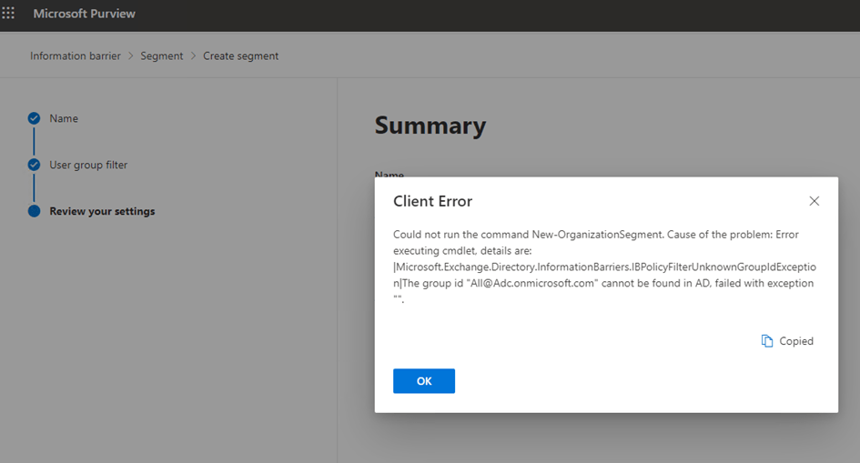 Ce groupe est donc bien présent dans Azure AD . Mais lorsque l’on tente de créer le segment d’information Barrier voila ce que l’on obtient . Et ça même après 15 Minutes.