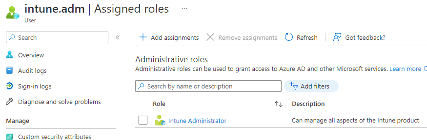 In our example it is this user that we have called intune.adm and on which we have assigned the administration role « Intune Administrator
