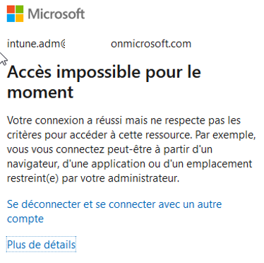 Si vous affecter le rôle intune Administrator à ce compte et que vous essayer de vous connecter depuis la Finlande par exemple sur https://endpoint.microsoft.com/ alors la connexion est refusée grâce à la règle d’accès conditionnels que nous avons créé et qui est illustrée ci dessous
