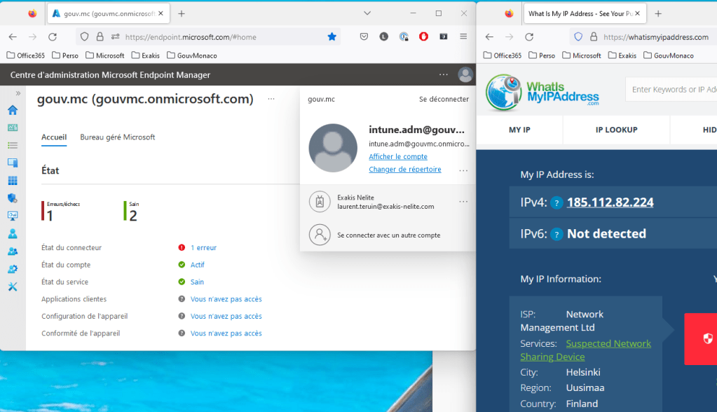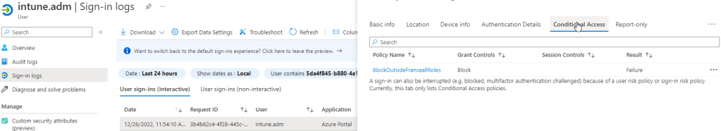 Bingo! the user now, administrator of Intune connects from Finland by overriding the rule of conditional access because these do not take into account the specific rights given in Intune. Your security model is crumbling a little bit, isn’t it?