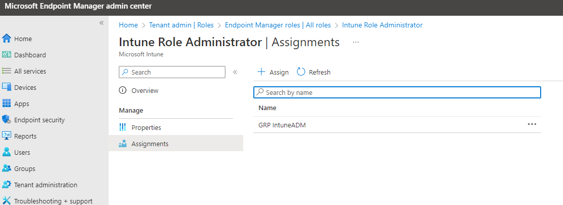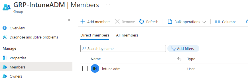 Let’s take the case of our intune.adm user. We are going to remove the Intune Administrator right but we are going to position it in a GRP-IntuneADM security group (see below) which will have the Intune Administrator right but this time positioned directly in the Intune environment like this