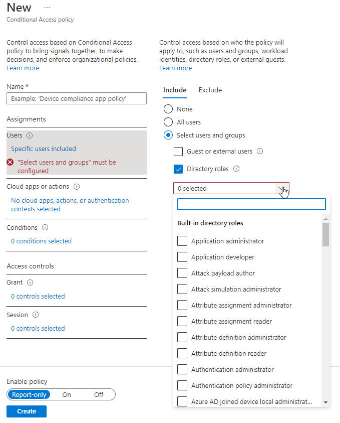 So the first report is about the conditional access rules that you are going to apply to the part of the users that have administrative roles in Azure AD. As strange as it sounds, you will not be able to select the « All roles » option because this option does not exist. You will have to select one by one (87 clicks) each administration role as shown in the following figure