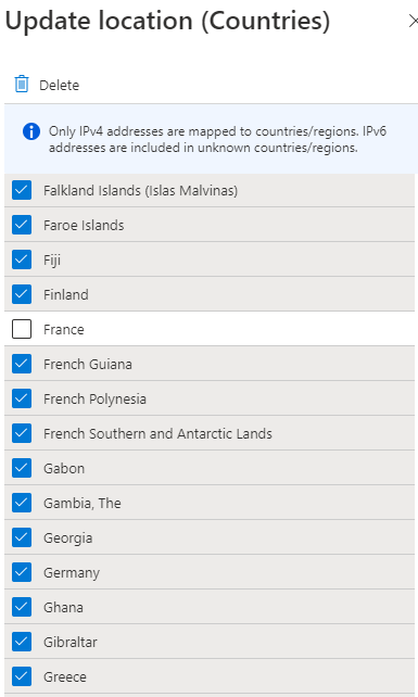 La société Maginot veut imposer le fait que toute personne ayant un ou plusieurs droits d’administration du tenant , si elle veut se connecter doit se connecter depuis la France. Pour ce faire elle doit créer une « NamedLocation » comprenant tous les pays sauf la France comme le montre la figure suivante et bannir l’accès depuis ces pays.