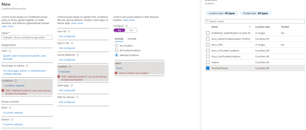 This location that we will name « TousSaufFrance » will be used to block the connections of users with an administration role who would try to connect outside France as shown in the following figure