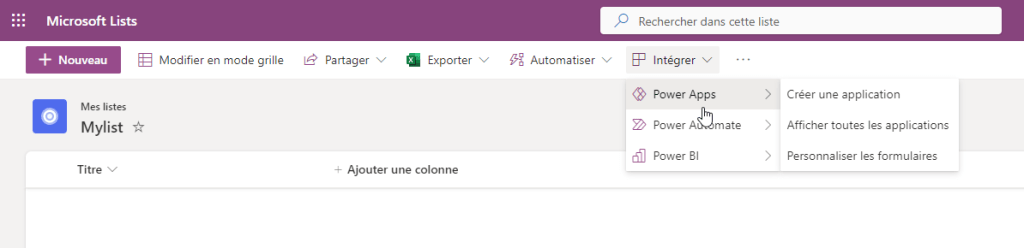 En exécutant l’application Lists qui est présente sur le portail 0365 de l’utilisateur , ce dernier a accès aux fonctions PowerApps et PowerAutomate.