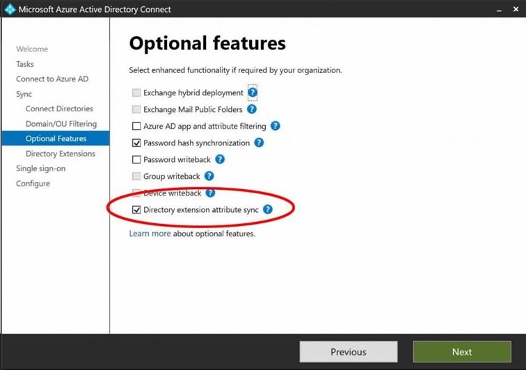 Why is this? It’s a mystery. But you can add it if you select the Directory extension attribute sync option as shown in the following image