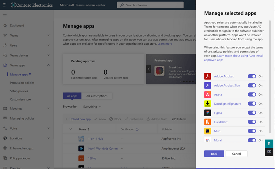 La fonctionnalité Microsoft Teams Auto install approved apps (anciennement appelée Zero-touch App Install) permet aux administrateurs et aux utilisateurs de rationaliser la gestion et l’utilisation des applications au sein de leur organisation. En tant qu’administrateur, vous pouvez activer la fonction d’installation automatique d’applications approuvées pour installer automatiquement des applications sur Teams pour les utilisateurs après qu’ils se soient connectés à des applications SaaS à l’aide d’informations d’identification Azure AD, tout en respectant les contrôles d’accès aux applications définis par les administrateurs. Cela permet de réduire les processus manuels et les coûts administratifs. Vous pouvez ajouter de manière transparente des applications que les utilisateurs ont utilisées en dehors de Teams, maximisant ainsi la valeur des licences SaaS existantes. Grâce à l’installation automatique d’applications approuvées, les utilisateurs n’ont pas à rechercher d’applications et peuvent continuer à utiliser les mêmes outils au sein de Teams pour rester dans le flux de travail sans changer de contexte.