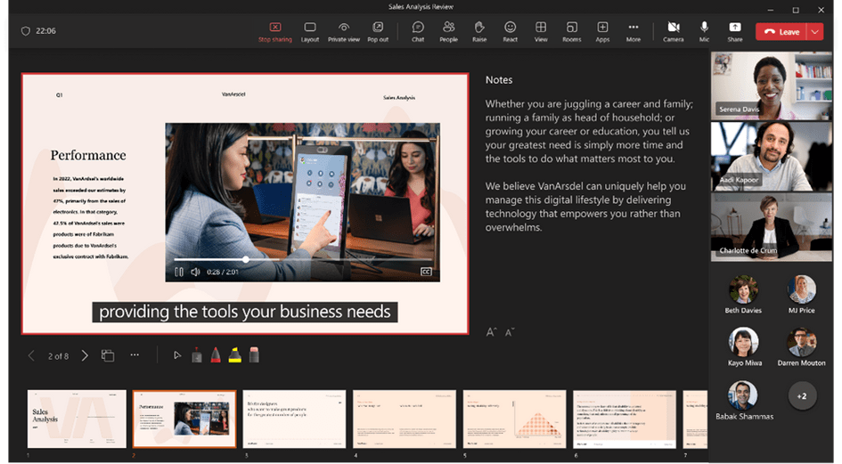 Lorsque vous créez une présentation PowerPoint dans PowerPoint pour Windows ou PowerPoint pour Mac, vous avez la possibilité d’inclure un fichier de sous-titres fermés avec votre vidéo. Lorsque la présentation est partagée via PowerPoint Live for Teams, toute vidéo intégrée qui inclut des sous-titres codés stockés dans un fichier séparé inclura automatiquement l’option permettant aux participants d’activer les sous-titres codés. Lorsque les sous-titres sont activés, ils apparaissent au bas de la diapositive. Si aucun sous-titrage n’est disponible pour une vidéo, le bouton de sous-titrage est désactivé.