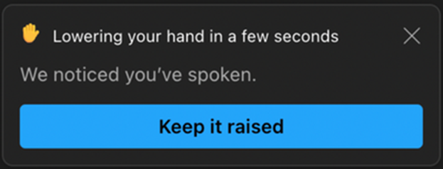 Si vous avez levé la main lors d’une réunion Teams et que vous avez pris la parole pendant la réunion, vous verrez une notification vous informant que votre main sera automatiquement abaissée sous peu. Vous pourrez choisir de garder votre main levée si vous le souhaitez en cliquant sur le bouton « Garder la main levée ». Si vous ne réagissez pas à la notification, votre main sera automatiquement abaissée. Cela devrait permettre aux organisateurs et aux présentateurs d’animer plus facilement les réunions. Cette version est déployée uniquement pour les utilisateurs de Microsoft Teams Desktop.