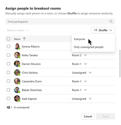 En tant qu’organisateur, co-organisateur ou gestionnaire de salles de réunion, vous pouvez utiliser les nouvelles fonctionnalités de la fonction Shuffle pour affecter les participants de manière aléatoire aux salles, soit avant la réunion, soit pendant la réunion en direct. Vous pouvez décider de mélanger tout le monde ou de ne mélanger que les participants non affectés afin de redistribuer les participants de manière égale dans les salles existantes.