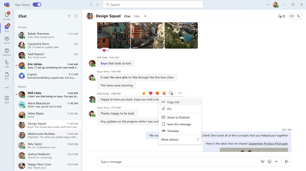 Lorsque vous souhaitez faire référence à un message spécifique dans une discussion de groupe, vous pouvez désormais partager un lien vers ce message. Le lien renvoie le destinataire directement à la conversation et lui permet de consulter l’historique des discussions relatives à la conversation, afin d’obtenir un meilleur contexte.