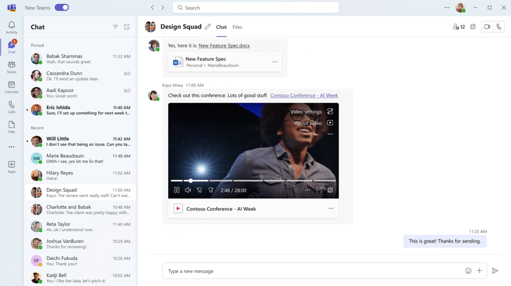 Lorsque vous recevez une vidéo Microsoft Stream dans un chat Teams, comme une réunion d’équipe enregistrée sur OneDrive ou SharePoint, vous pourrez prévisualiser et lire la vidéo directement dans le chat.