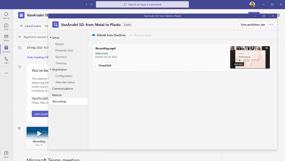 À l’issue d’un webinaire, un enregistrement à la demande est disponible pour que les organisateurs puissent le gérer et le partager de manière transparente avec les participants. Les organisateurs peuvent publier un enregistrement à la demande de leur webinaire dans l’expérience de gestion des webinaires et un courriel est automatiquement envoyé aux participants avec un lien pour accéder à l’enregistrement. Les organisateurs peuvent prévisualiser l’e-mail et en modifier le contenu avant que l’enregistrement à la demande ne soit partagé avec les participants.