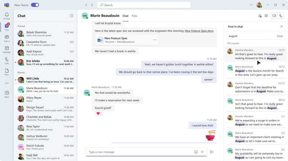 Passer au crible de nombreux messages et conversations dans vos chats et canaux pour trouver le contenu dont vous avez besoin peut prendre beaucoup de temps. L’amélioration de l’expérience de recherche permet de trouver rapidement votre contenu. Utilisez le raccourci clavier CTRL+F (ou Commande + F pour Mac) pour afficher la fenêtre de recherche « Rechercher dans le chat » ou « Rechercher dans le canal », tapez le mot clé dans la fenêtre de recherche et les résultats relatifs au chat ou au canal spécifique s’afficheront sur le côté droit de l’écran. En sélectionnant le résultat de la recherche qui répond à vos besoins, vous accédez au message en question, ce qui vous permet de mieux comprendre le contexte. Ce service sera disponible d’ici la fin de l’année.