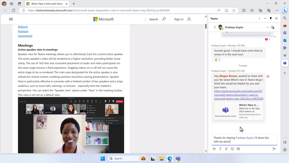 Lorsque vous ouvrez un lien vers une page web à partir de votre chat Teams dans Microsoft Edge, la fenêtre de chat vous suit dans le navigateur Edge afin que vous puissiez afficher le contenu et le chat côte à côte et poursuivre la conversation. Vous pouvez accéder à vos discussions récentes et commencer de nouvelles discussions directement à partir d’un volet de discussion intégré dans la barre latérale de Edge, sans avoir à passer d’une application à l’autre. Cette fonctionnalité sera disponible dans le courant de l’année.