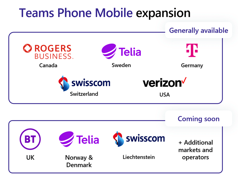 Teams Phone Mobile, une solution d’appel d’entreprise axée sur la mobilité, vous permet de permettre à votre personnel mobile d’utiliser un seul numéro de téléphone mobile fourni par l’entreprise comme numéro de Teams Phone, débloquant ainsi de nouvelles capacités et augmentant l’efficacité. Teams Phone Mobile est actuellement disponible aux États-Unis, au Canada, en Allemagne, en Suède et en Suisse, et sera disponible plus tard cette année au Danemark et en Norvège avec Telia et au Liechtenstein avec Swisscom.