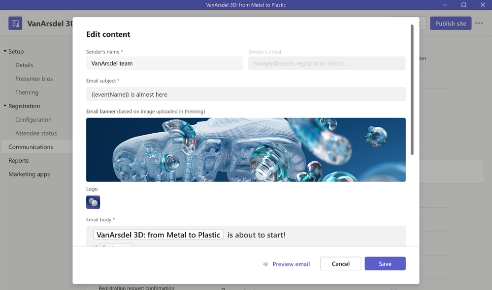 Les organisateurs peuvent modifier et personnaliser les communications relatives aux webinaires, notamment la confirmation d’inscription, l’annulation, l’e-mail de rappel, l’inscription d’un participant sur une liste d’attente, etc. Vous pouvez modifier le nom de l’expéditeur, la ligne d’objet, ajouter une bannière et un logo personnalisés, et mettre à jour le corps de l’e-mail. Pour les e-mails de rappel, vous pouvez également personnaliser le moment où l’e-mail est envoyé.