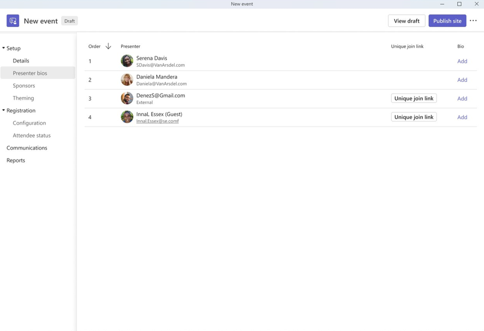 Lorsque les organisateurs ajoutent des présentateurs externes à un webinaire ou à un forum de discussion, ces derniers reçoivent un courriel contenant un lien unique leur permettant de participer à l’événement. Ce lien unique permet au présentateur externe de contourner automatiquement le hall d’entrée et de rejoindre une assemblée publique directement en tant que présentateur, ce qui simplifie le processus pour les organisateurs et les présentateurs externes.