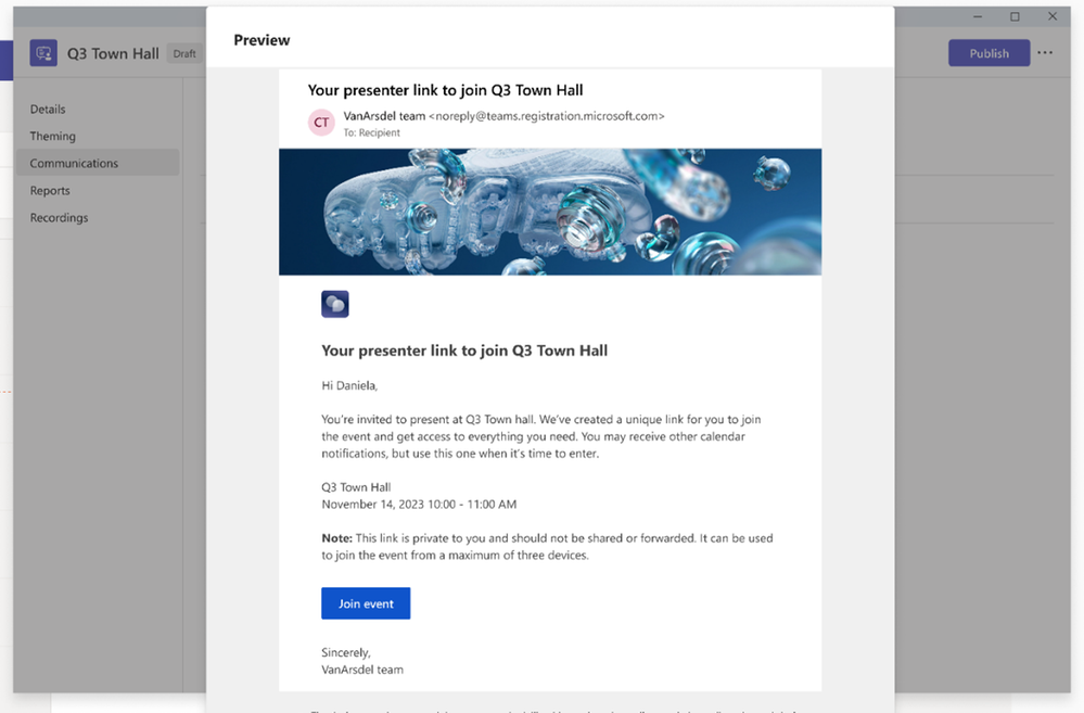Les fonctionnalités avancées de l’hôtel de ville comprennent une échelle supplémentaire allant jusqu’à 20 000 participants avec prise en charge des questions-réponses, jusqu’à 50 événements simultanés dans un locataire, des informations en temps réel, des modèles d’e-mails personnalisables, la prise en charge du réseau eCDN de Microsoft et la prise en charge de langues supplémentaires pour les sous-titres traduits en direct, et plus encore. Les fonctionnalités avancées nécessitent une licence Teams Premium. En savoir plus sur les assemblées générales dans Microsoft Teams.