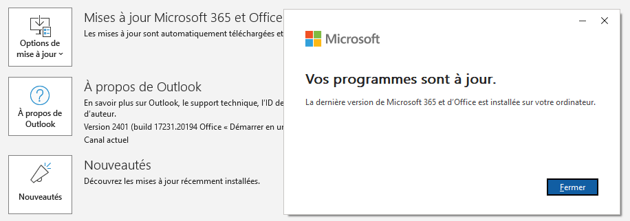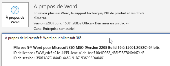 Entre temps nous mettons à jour la suite Office. Puis nous redémarrons le poste de travail pour qu’il se déconnecte de la suite Office et se reconnecte. Comme le montre la figure suivante le poste de travail utilise le canal actuel et possède la dernière version de la suite Office