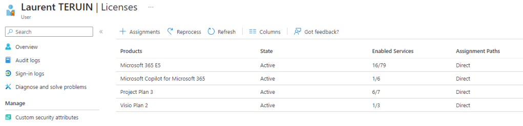 La figure ci dessous précise l’affectation de la licence via le portail EntraID