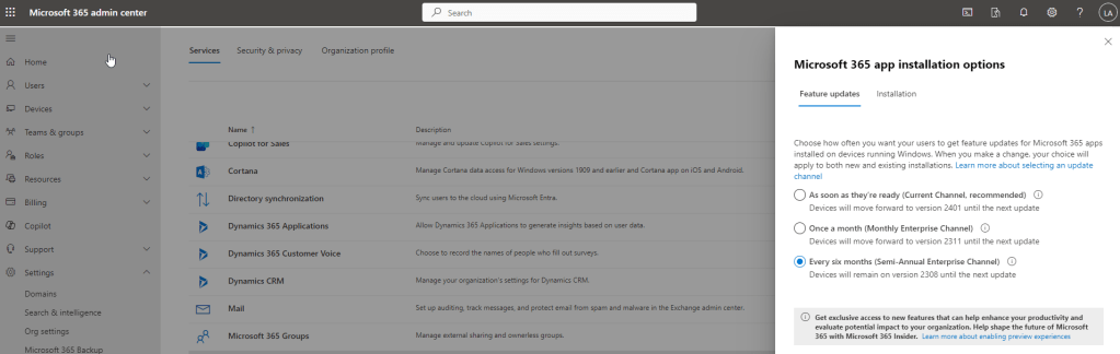 Pour vérifier quelle fréquence de mise à jour de la suite office, votre organisation utilise, allez dans Microsoft 365 admin center , sélectionnez Settings / Org Settings / Microsoft installation Options, comme le montre la figure suivante