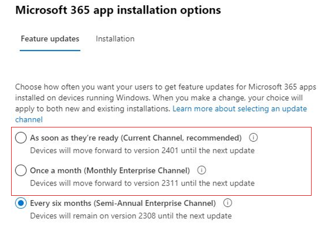 Allez dans Microsoft 365 admin center , sélectionnez Settings / Org Settings / Microsoft installation Options, et positionner la valeur a « Actuel » ou « Mensuel ».