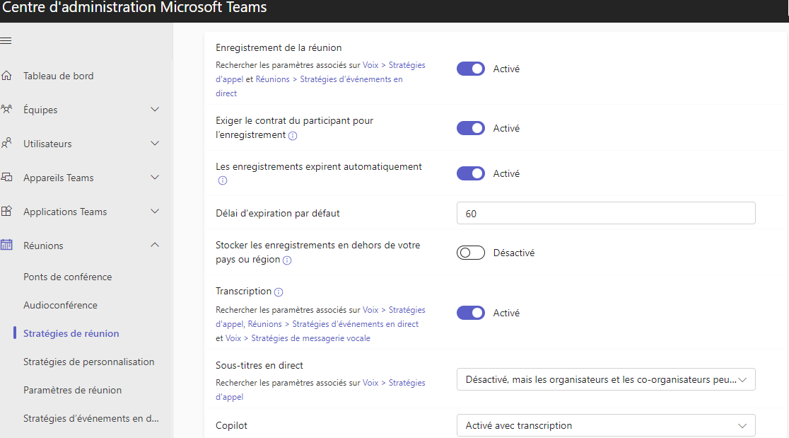 - Microsoft Teams. Pour utiliser Copilot pour Microsoft 365 avec Microsoft Teams, vous devez utiliser le client de bureau ou le client web Teams. La version actuelle et la nouvelle version de Teams sont toutes deux prises en charge. Pour permettre à Copilot dans Teams de référencer le contenu de la réunion une fois celle-ci terminée, la transcription ou l’enregistrement de la réunion doit être activé. Pour ce faire, allez dans le portal d’administration de Microsoft Team, et modifier une stratégie ou créez une nouvelle stratégie que vous affecterez à vos utilisateurs pilotes.