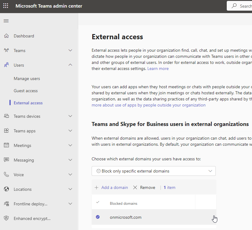 Action 1 : Activer l’option de bloquer certain domaine dans l’interface d’administration Teams