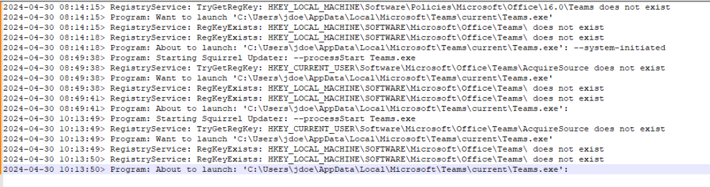 We looked in the SquirrelSetup.log file in the user’s AppData\Local\Microsoft\Teams directory, but found nothing significant. Difficult in this case to find the reason for this failure.