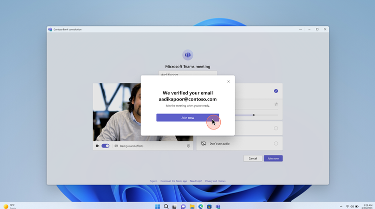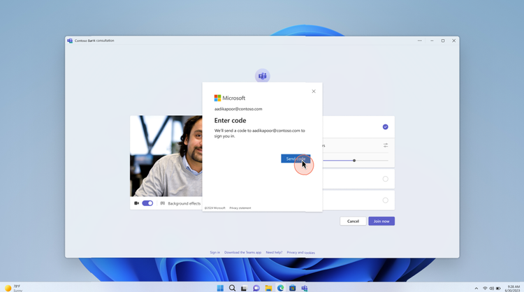 Expérience des participants : lorsque les organisateurs choisissent d’interdire aux participants non vérifiés de rejoindre les réunions, ces derniers doivent s’authentifier lorsqu’ils tentent de rejoindre la réunion. S’ils possèdent un compte professionnel, un compte scolaire ou un compte Microsoft personnel, ils peuvent utiliser ces informations d’identification pour l’authentification. Les participants qui ne possèdent aucun de ces comptes Microsoft devront s’authentifier en saisissant leur adresse e-mail, à laquelle sera attribué un code d’accès à usage unique pour la vérification.