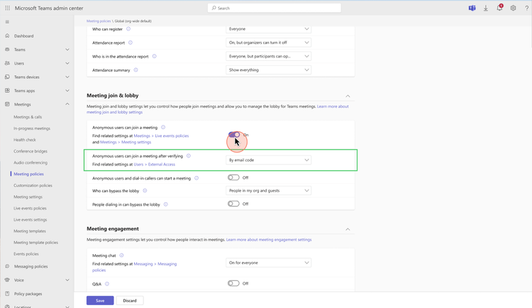 Contrôles d’administration : les administrateurs qui gèrent les politiques des locataires disposeront d’une nouvelle politique de réunion intitulée « Les utilisateurs anonymes peuvent rejoindre les réunions Teams après vérification par code e-mail », comme indiqué dans la capture d’écran ci-dessous. Cette nouvelle politique de réunion complète la politique de réunion existante selon laquelle les administrateurs des locataires ont déjà le contrôle pour permettre aux « utilisateurs anonymes de rejoindre la réunion sans vérification ».