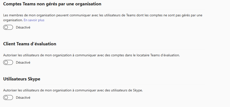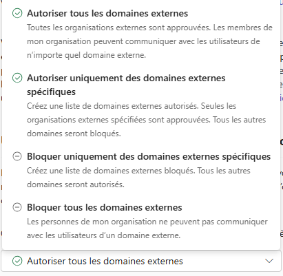 Comme vous le savez, par défaut les connexions externes sont de type ouvertes, c’est a dire que ‘nimporte quel utilisateur externe peut , par Teams et le Tchat, solliciter vos utilisateurs pour démarrer une conversation.