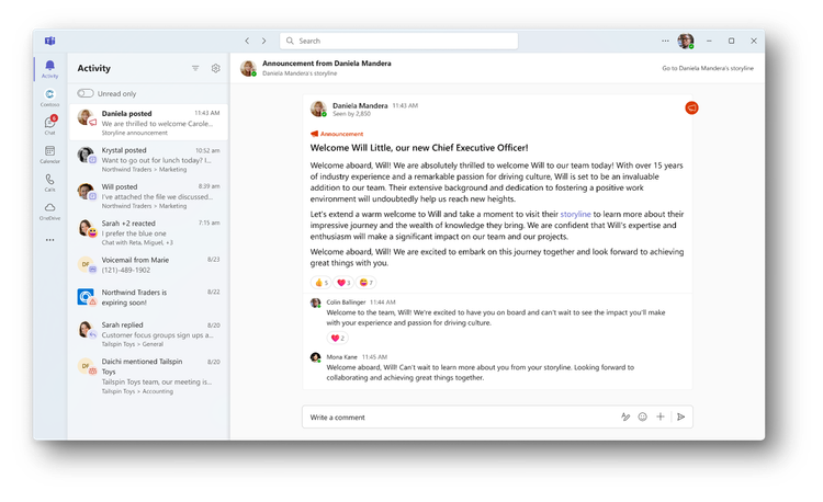 Les scénarios de Viva Engage vous permettent de créer, de partager et de découvrir du contenu avec d’autres personnes de votre organisation, favorisant ainsi la collaboration et la connexion grâce à du contenu et des expériences personnalisés. L’intégration de Storyline dans Microsoft Teams vous permet de suivre les mises à jour et les notifications de la direction, de découvrir du contenu et de partager vos idées et vos points de vue tout en restant dans votre flux de travail dans Teams. Cette mise à jour, qui sera disponible début 2025, offre aux dirigeants un nouveau moyen de partager des communications avec l’ensemble de l’entreprise à l’aide de Microsoft Teams. L’intégration complète de la communauté et bien plus encore arriveront l’année prochaine.