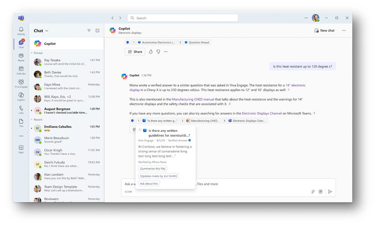 L’intégration de la fonctionnalité Engage Q&A garantit que des connaissances fiables et expertes sont mises en avant dans Copilot. Cela va changer la donne dans la vaste source de connaissances en augmentant la précision et la cohérence des réponses de Copilot. Bientôt, vous verrez des réponses vérifiées dans la carte de référence de Copilot. Grâce aux réponses vérifiées, vous pouvez être assuré que les informations sont fiables. Et bien sûr, vous pourrez voir la source et cliquer dessus pour avoir du contexte.