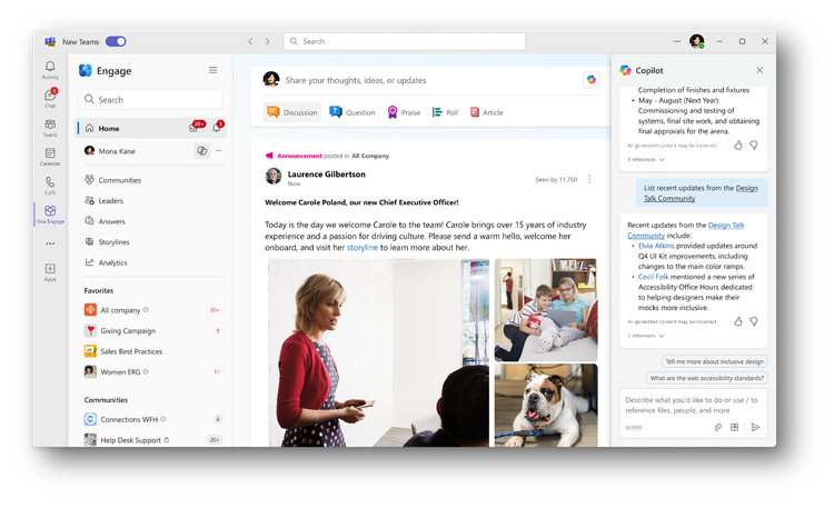 Aujourd’hui, à l’occasion de Microsoft Ignite, nous avons annoncé de nouvelles expériences dans Viva Engage conçues pour permettre aux dirigeants et aux employés de partager, de se connecter et de communiquer, avec de nouvelles intégrations entre Viva et Microsoft 365 et de nouvelles façons d’exploiter la puissance de Copilot et de l’IA pour la découverte, la modération et l’analyse des connaissances. Voici un compte-rendu complet des dernières nouvelles :