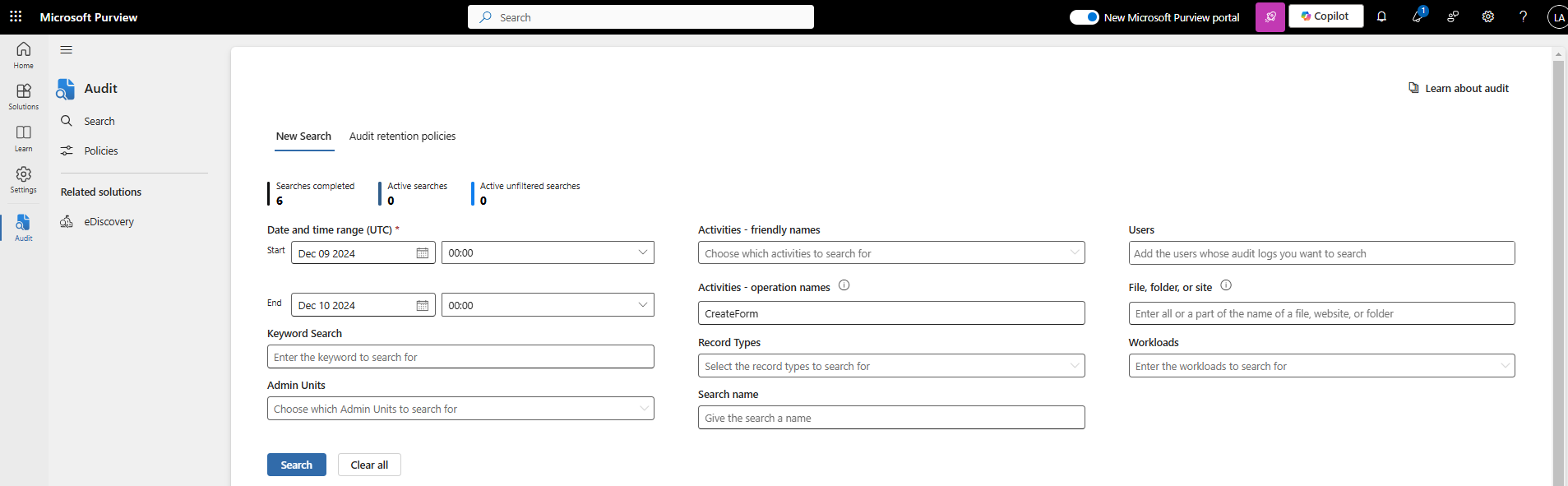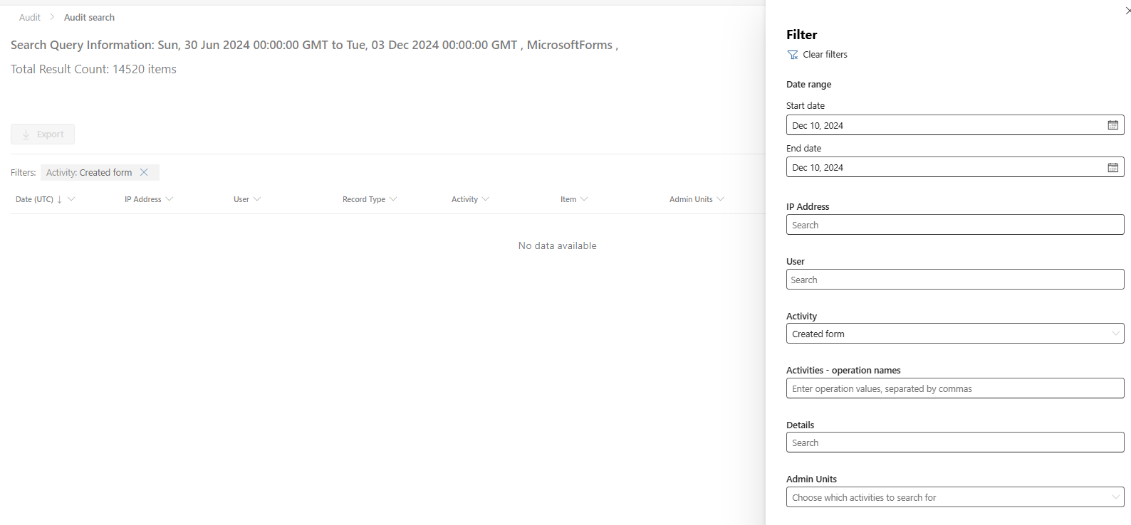 Search-UnifiedAuditLog -StartDate 12/01/2024 -EndDate 12/10/2024 -RecordType PowerAppsApp -Operations createform