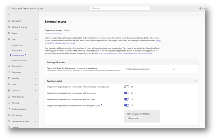Grâce à cette fonctionnalité de Teams, vous pouvez empêcher les utilisateurs de votre organisation de collaborer avec des personnes spécifiques extérieures à l’organisation. Les administrateurs peuvent désormais établir une liste d’utilisateurs bloqués et ne pouvant pas collaborer avec leur organisation. Si un utilisateur est ajouté à la liste de blocage, les membres de votre organisation ne pourront pas avoir de conversations individuelles et de groupe avec ces utilisateurs. Si des conversations existent déjà avant qu’un utilisateur ne soit ajouté à la liste de blocage, l’utilisateur bloqué sera supprimé de la conversation.
