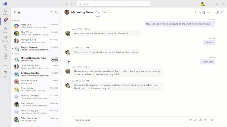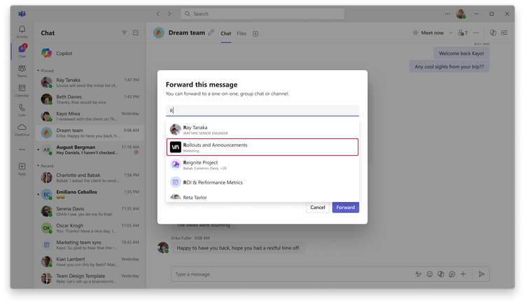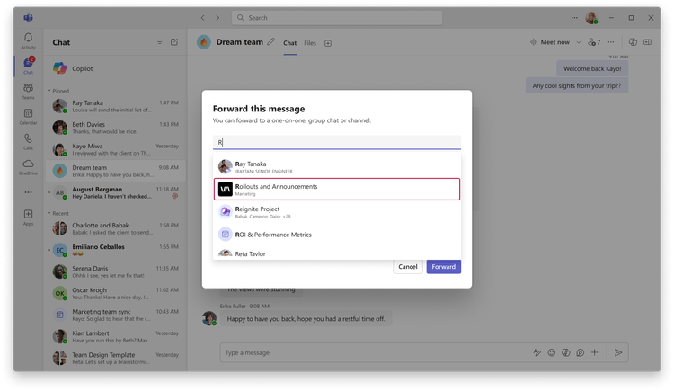 Vous pouvez désormais transférer des messages entre les canaux, ce qui vous permet de partager des informations importantes avec les membres de l’équipe concernés en moins de clics. Pour transférer une publication de message de canal, une réponse à une publication de canal ou un message de chat vers un autre canal, une discussion individuelle ou de groupe, sélectionnez le menu de points de suspension du message et choisissez Transférer. Vous pouvez également ajouter un contexte supplémentaire au message et @mentionner les destinataires pour plus de clarté et d’alignement.