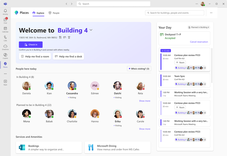 Grâce à l’emplacement de travail dans Teams, qui inclut désormais les bâtiments, faites connaître votre présence, coordonnez-vous avec les autres et profitez à l’avenir de la réservation assistée par l’IA. Une fois activée et activée, votre présence sur le lieu de travail peut être automatiquement mise à jour vers un bâtiment spécifique lorsque vous vous connectez à un périphérique sur un bureau réservable ou une salle BYOD.