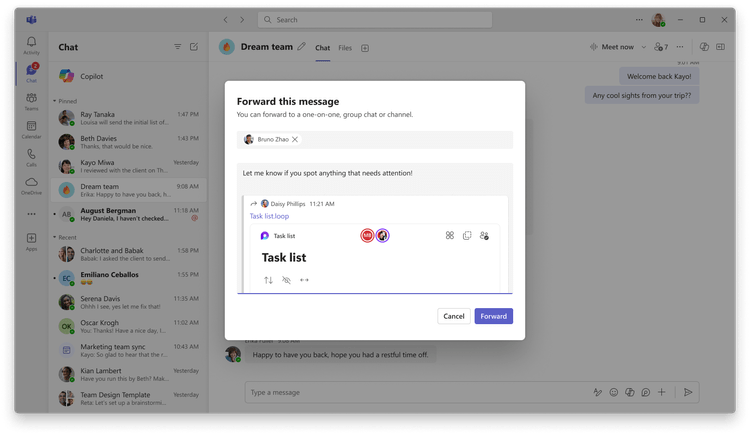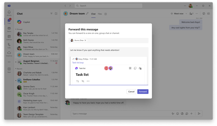 Vous pouvez désormais transférer des messages de chat contenant des composants Loop, ce qui permet un partage transparent et une collaboration en temps réel entre différents chats et canaux. Pour transférer un message avec un composant Loop, accédez-y, cliquez sur les points de suspension (trois points) et sélectionnez « Transférer » dans le menu. Lorsque les composants Loop sont partagés, leurs autorisations sont conservées, ce qui garantit que les destinataires disposent des droits d’accès appropriés. Cette fonctionnalité est disponible sur ordinateur et sur mobile.