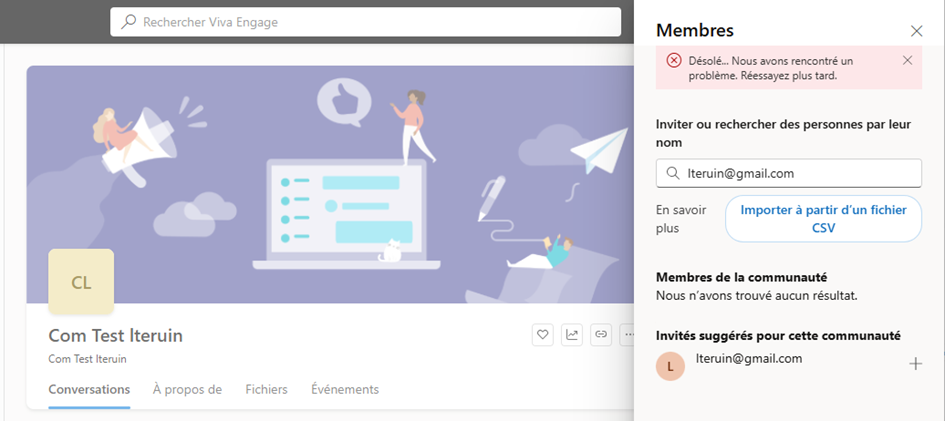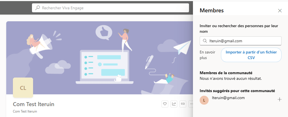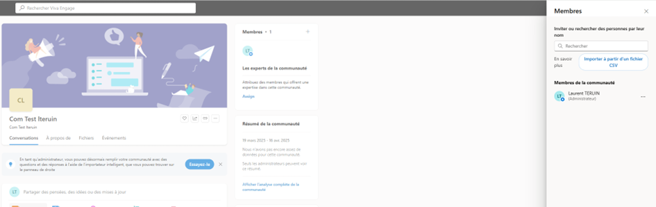 L’utilisateur en question est administrateur d’un communauté Viva Engage comme le montre la figure suivante et tente d’ajouter un compte invité dans cette communauté.