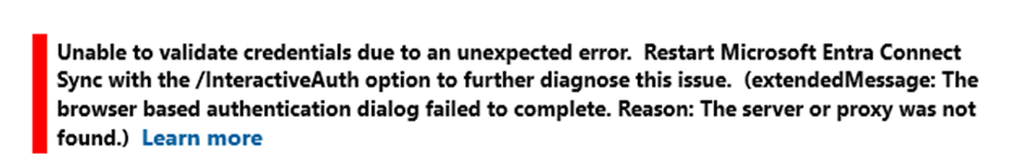 [15:10:20.680] [ 16] [ERROR] Authenticate-MSAL: unexpected authentication failure [authentication_ui_failed] – The browser based authentication dialog failed to complete. Reason: The server or proxy was not found..