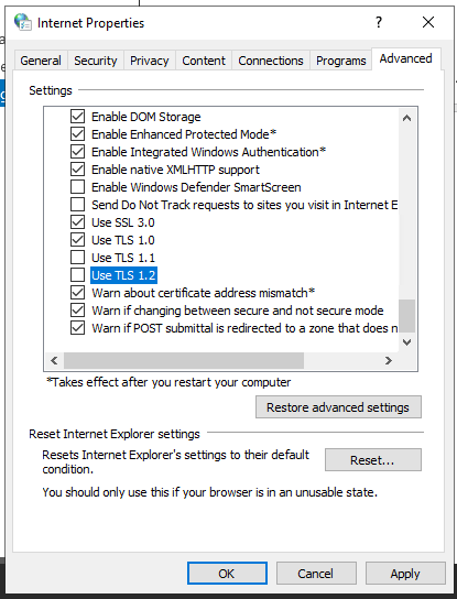we found an very interesting option on internet properties. the TLS 1.2 was not checked.