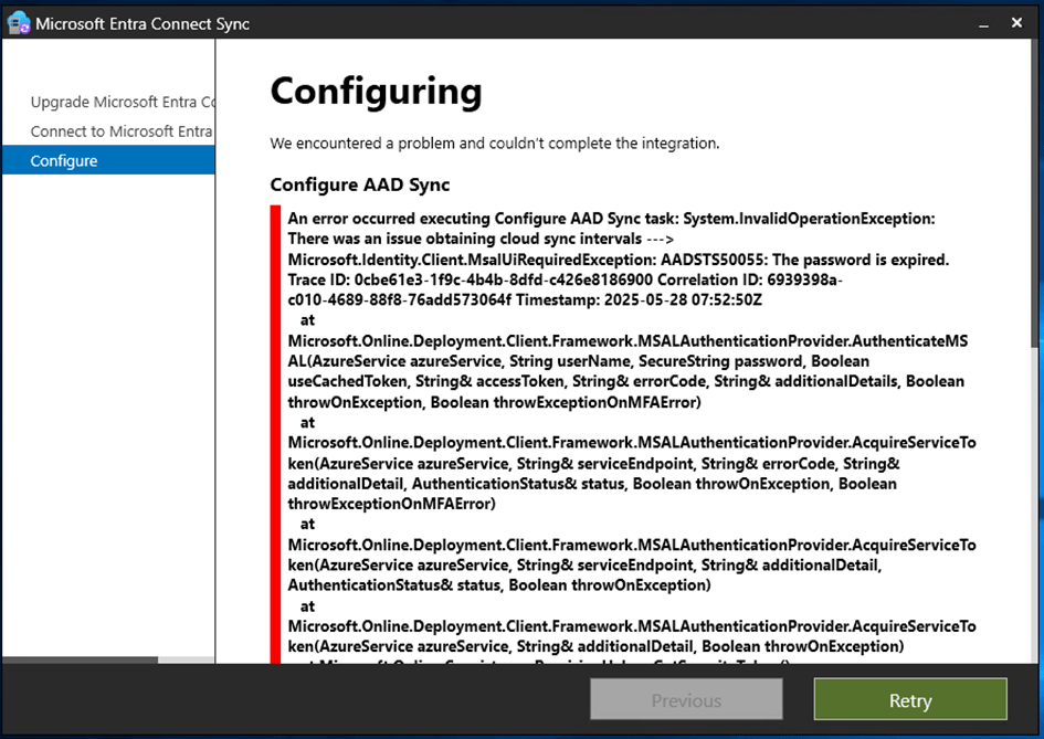 Ce matin je tente de mettre à jour Microsoft entra Connect avec les nouvelles versions et je me connecte avec un compte admin du tenant, et étrangement je rencontre cette erreur ci dessous. Je crée un compte spécifique, un nouveau compte global admin du tenant sans le MFA je ressaye et je rencontre la même erreur.