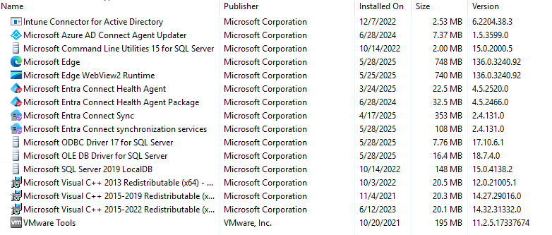 Programmes installés et version de Entra connect / Installed programs and version of Entra connect